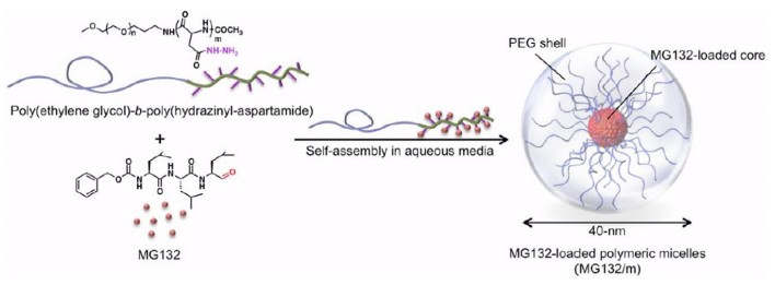 Polymeric micelles are usually comprised of micelles and other linear co-polymers, such as linear poly(ethylene) glycol(PEG) and polyaminoacids such as poly(hydrazinyl)aspartamide. The linear polymers are conjugated with drug molecules through covalent bonding. The drug-polymer complex is then introduced into micelles through simple self assembly in aqueous media, which is usually water [2]. MG132 is a peptide aldehyde used in protein inhibition. Research has shown successful loading of MG132, with a loading efficiency of up to 75%. Polymeric micelles have been shown to successfully transport cisplatin and paclitaxel in animal studies. Clinical trials are currently underway to fully adopt them in targeted delivery of cisplatin in cancer therapy [2].