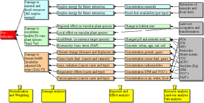 Life Cycle Assessment - Referred to as LCA this method is an life cycle assessment of a product or service's environmental impact from its extraction (or beginning) to its end life. At first an inventory of all relevant environmental data is collected for every phase of the life cycle. Consequently, Tthe eco indicator was developed as an eggregation of complicated Life Cycle data into simple categories that enable evaluating environmental impacts of a product, and product comparisons. The eco indicator 99 is a weighting method of impacts into predefined categories and is widely used in Life Cycle Assessment in the LCIA (LCA Inventory analysis) stage. Relying on previous experience (Eco indicator 95) where too many categories were defined (e.g. acidification, eutrophication etc) the designers of the Eco indicator 99 defined 3 categories. Too many categories resulted in a difficulty to determine the relative contribution of each category on ecosystem and man and then arriving at a global score by summation. The three damage categories are 1) Human health - the overall number of diseases and life years lost due to impacts that cause disease such as ozone depletion, climate change, toxics etc (units of DALY). 2) Ecosystem Quality - it is evaluated as the change in biodiversity. Land use changes, toxicity and more all contribute. 3) Resources - the amount of surplus energy required in the future to extract the resources in question. This assumes that the more a resource is extracted the more energy consuming it becomes to extract it in the future since that resource becomes more scarce. The units of the eco-indicator are arbitrary and are refereed to as Pt, where 1/1000 of a Pt is estimated as the environmental impact of an average European throughout a year. The eggregation process of the Eco indicator from emissions (impacts) into scores is noted in figure 1. For each category damage models had to be used to assess the score and weighting figure 1: Eco Indicator 99 Methodology; from www.pre.nl/eco-indicator99/ Environment product declarations or EPDs are aimed at standardizing environmental impacts of products by providing specific categories for specific products and simplifying Life Cycle Assessments[7]. Or in other people words "Environmental Product Declarations are defined by ISO 14025 as being “quantified environmental data for a product with pre-set categories of parameters based on the ISO 14040 series of standards, but not excluding additional environmental information.” While this sounds confusing, an EPD is essentially a verified document containing LCA results and additional product and environmental performance information. It is a single source for finding diverse information about a product’s environmental performance, verified by a qualified third party" [8]. A climate Declaration is a single environmental impact category (GHG in CO2 equiv.) used to asses a product [9], intended to further eggregate the complicated multi-category EPD. "A climate declaration "describes the emissions of green-house gases, expressed as CO2-equivalents for a product's life cycle. It is based on verified results from life cycle assessment (LCA) - based information in accordance with ISO 14025"." [10]. A recent attempt to eggregate LCA data in a different way is done by Geortgakellos [1]. Aware of the time and effort consuming of LCA inventories construction combined with the need to provide designers and policy makers with practical tools, he proposes a methodology which is based on a low and high level aggregation. In the first step, as in LCA, low level aggregation is performed for inventories with the same measuring units. Afterward a high level aggregation is performed on categories with different measuring units but with common basis (e.g. all pollutants) resulting in a 5-category polygon. This aggregation is done by dividing each pollutant with the threshold value allowed for this specific pollutant, resulting in the amount of mass of air or water needed to dilute each emission to acceptable values defined by the threshold value. The resulting polygon area is a measure of the environmental impact, the higher it is the greater the environmental impact of this specific product.
