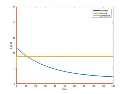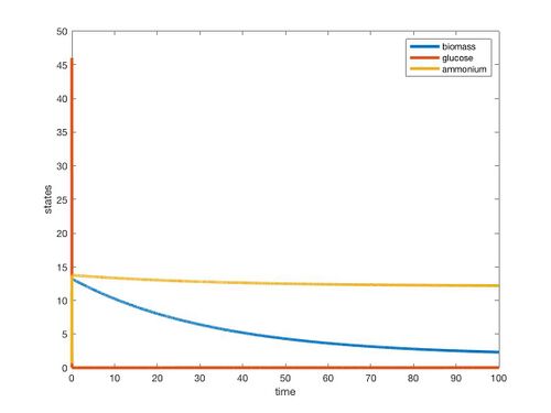 The purpose of this week's assignment was to create MatLab code that find the steady states of a 2-nutrient chemostat. This required creating differential equations that would find the steady states of biomass, glucose, and ammonium.
