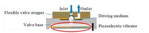 Piezoelectric valve is slightly different from the other two methods of electrically activated valves. The structure of these microvalves involves a piezo-actuator, the valve membrane which is also known as the valve stopper, and the valve seat. This valve operates by a piezoelectric crystal stretching from the electric field applied on it, causing the valve membrane to deform into the microchannel stopping fluid flow.[2] There are multiple different types of piezoelectric devices, but looking at Figure 4 is an example of a normally closed piezoelectric valve with a stopper. How the normally closed valve operates it by sending an electric signal to the piezoelectric vibrator, causing it to deform down, decreasing fluid pressure in the chamber, and deforming the driving medium, opening the valve.[2] From research on different types of piezoelectric valves, it has been determined that the opening time is shorter than 10 ms, it had low power consumption, and there is continuous and precise control over the valve. But also suffers from a high-voltage needed for actuation.[1]