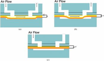 Electrostatic valves are generally comprised of a valve-opening and closing electrode, and a flexible membrane, typically made from either polydimethylsiloxane (PDMS), but other materials have been used such as copper foil.[1] These valves are typically normally closed, but have also been used in open microvalves. There is no real major difference between the two except for the original shape of the membrane layer. Typically, for normally open valves, the membrane is concave, while for normally closed valves, the membrane is flat.[1] These are similar to pneumatic valves, which are talked about extensively here. These valves are operated by controlling the voltage between the electrodes, which is applied through the membrane, causing the membrane to bend, either opening or closing the valve. These valves have been shown to have fast response time and low energy consumption when controlling gasses.[2] It is important to note though, when controlling liquids, the valves require a higher applied voltage, and due to this, these types of valves are typically only used to control airflow.[2]
