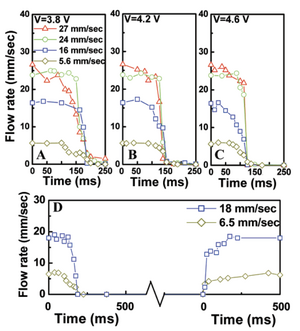 Various challenges occurring depending on the application of electrochemical bubble valves and the way they are implemented. While electroosmosis is currently used in biochemical molecule separation, a problem presented is the amount of power consumption and voltage required in order to create a bubble to regulate fluid flow within a channel.2 This challenge varies from different applications and studies but is the most commonly reported challenge. Pumps and valves are commonly used but are still in development to improve current setups to prevent clogging of bubbles. Clogged bubbles are also a result of the transport liquid system which can be affected by the type of electrode system setup since many applications report using upwards of a 5-way electrode pair or higher.3 This can also be bypassed by incorporating a check valve but is still in research and development. Within electroosmosis, one study showed difficulty in separating acidic electrolytes from the sample solutions that obtained varying pH, but a bubble was generated between these two solutions and consistent flushing between the buffer solutions occurred.2 Figure 4 displays research from one group, and how their results help interpret and readjust their current form of electrochemical bubble valves. Based on the Figure 4A-C, the varying flowrates are dependent on the amount of voltage across the electrode through the channel. With an increase in voltage (V = 4.6V), the valve closing flowrates become steeper with the increase in voltage. Figure 4D represents the valve opening characteristic where both the opening closing are dependent on the rte of collapse of the bubble valve. The bubble valve is also dependent on the hydraulic resistance present in the valve opening.
