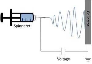Electrospinning is a simple technique in which a mat is fabricated from nonwoven fibers with diameters ranging from nano to micro sized. The electrospinning technique can be used to spin a variety of natural and synthetic polymers. Electrospun fibers can be used in a wide range of applications ranging from drug delivery, liquid filtration, nano-sensors and military clothing. The process to create these non-woven mats utilizes a syringe filled with the polymer solution of choice. The solution is dispensed from the needle tip at a very low feed rate. Simultaneously a voltage is applied to the needle tip as well as a copper plate (typically around 10 cm away from the needle tip). Once this voltage is applied, the polymer extends to copper plate in fiber form, while the solvent evaporates. This produces the electrospun fiber mat. Figure 1 illustrates the process schematic.[1] The electrospinning process has many parameters that can be manipulated in order to fine tune the desired mat. For example, the distance from the copper plate to the needle tip can be increased in order to decrease fiber diameter; spinning time can be increased to create a higher density fiber mat. Additionally there are myriad polymer solution choices. The choice of polymer is very application dependent. For instance, cellulose acetate can be spun to create mats that would optimize wound healing (Figure 2). Similarly chitosan can be spun in order to create anti-bacterial membranes.[4]Beside a user defined polymer choice, another benefit of electrospinning is the spinning method itself. For example a lot of research has gone into using a rotating drum to create a tube of fibers. There are some collector mechanisms that even produce an aligned arrangement of fibers as opposed to the non-woven matrix.[5]
