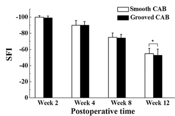 After 6 weeks, the regenerated nerves for the smooth conduit and the grooved conduit were found to be 56% and 65% of the nerve's original diameter, respectively. After 12 weeks, the regenerated nerve grew to 71% and 76%, respectively. SFI is an index that indicates nerve function. Normal nerve function is at 0, while complete nerve dysfunction is at 100. In the first weeks of the study, the conduit groups had no significant difference in nerve function. By the twelfth week, the grooved CAB conduit group demonstrated a significant difference in nerve regeneration compared to the smooth conduit group. The surface-grooved conduits also showed a higher density of neurofilaments in the regenerated sciatic nerve as well as a higher number of cells, compared to the smooth conduits.