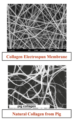 One of the main attractive characteristics of electrospinning is the ability to structurally imitate the extracellular matrix (ECM) [1]. Electrospinning creates a mat that has a high surface area to volume ratio and an interconnected three-dimensional porous network, crucial properties of the ECM [6]. Shown in Figure 3, a collagen electrospun mat show some resemblance to the natural collagen network found in pigs. In the ECM are several proteins including collagen, chitosan, gelatin, chitin, and hyaluronic acid. These are natural polymers, and independently, the polymers are difficult to electrospin on their own. The polymers also lack the physical properties of the ECM once electrospun. To overcome this obstacle hybrid polymers were created, Using PLGA with collagen and elastin improved the mechanical properties of the fiber mat compared to just the collagen and elastin alone [1]. By being able to incorporate the native proteins into the scaffold, along with the synthetic polymers, the synthetic ECM could potentially imitate the native ECM in its functions, such as promoting cell adhesion and migration or enabling diffusion of nutrients and wastes [6] Mimicking the native ECM allows for better cell adhesion and cell proliferation, making electrospinning a highly studied topic in tissue engineering [14].