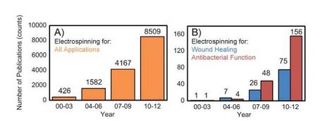 Perhaps one of the most researched applications is electrospun fibers used for wound dressings and wound healing (Figure 4). Non-fatal burn injuries are one of the major causes of infection and disease. Around 265,000 deaths each year are due to burn related injuries. Current wound dressings must be improved in order to better prevent infection and allow air diffusion through the bandage. A promising wound dressing alternative would be a bandage composed of electrospun fibers to treat burns and other related skin issues such as chronic ulcers. Electrospun fibers have many medical benefits including optimum porosity, and high surface-to-volume ratio. These properties, on a nanoscale basis, lead to enhanced natural skin healing, moisture retention and exudate removal. Therefore electrospun mats could provide wounds with an effective, protective barrier similar to the extracellular matrix (ECM). Previous work has shown that nanofiber mats increase cell proliferation, growth factors, and cellular ability to heal [2]. There is also research that suggest these wound dressings could not only aid in the healing process, but also serve as anti-microbial agents. In one study a solution of CA (0.5 and 5.0%) incorporated with chitosan/poly(ethylene oxide) (PEO) was successfully spun. These nanofibers demonstrated the ability to decrease activity rates of Escherichia coli and Pseudomonas aeruginosa. Thus electrospun fibers have the potential to combat bacterial infections [7].