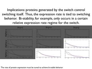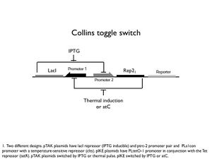 Switch controlled by proteins it creates. Proteins bind to promoter regulatory sites to repress or activate expression. This results in two stable states: proteins (repressor) repress their own repressor, so they will remain stably expressed. But, switching is controllable switching: dominant repressor (state) can be de-activated with addition of inducer (IPTG, thermal shock, etc). This allows expression of the other repressor, and enables controllable state change of the system Collins, 2000.
