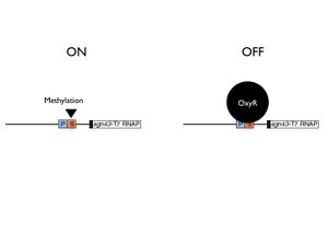 With feedback regulation, protein concentration determines the state and state change is driven by altering protein expression levels. Bi-stability is therefore observed only within a particular regime of relative repressor protein expression levels. Here, bi-stability is observed independent of the expression level of the gene that is being controlled. However, the repressor switch can be controlled by addition of inducer, which interacts with and turns off the repressor currently expressed. This drives the system into the other expression state. Here, there appears to be no inducer analog. How can switching between on and off methylation states be controlled? Moving from ON to OFF requires dilution of methylated DNA via replication. Moving from OFF to ON requires dissociation of OxyR.