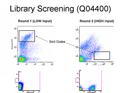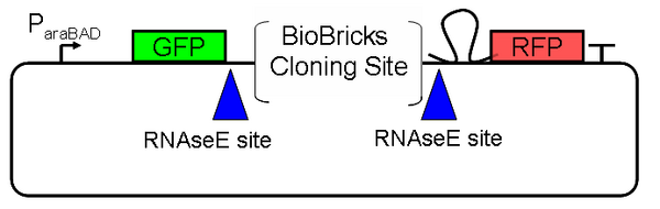 Design of Screening Plasmid 1.0: We are using the Pbad arabinose-inducible induction system [1] as a tunable input. GFP is a measure of input and RFP is a measure of output. A Biobricks cloning site enables easy insertion of any Biobricks part. RNase E sites create independence between the mRNA stability of the device being screened and the mRNA stability of the fluorescent proteins. In particular, we suspect mRFP1 contains internal RNaseE cut sites and have added a hairpin 5’ of the coding region to slow degradation by RNase E. [2]