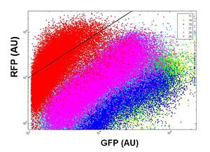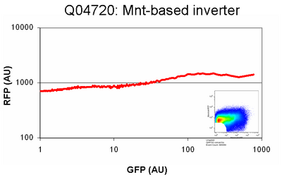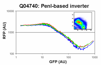Characterization of Q04740: Dot plot of one replicate is shown in upper right. Mean RFP expression for 3 replicates is plotted against GFP showing characteristic inverter transfer curve.