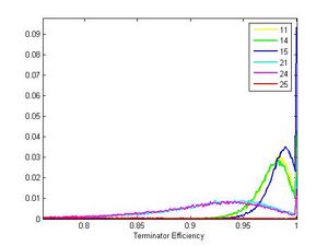 Characterization of 6 terminators from the Registry of Standard Biological Parts inserted into the Screening Plasmid. The black line is the best fit to the empty screening plasmid, and serves as a standard for 0% termination efficiency. Functional terminators should lie below the line, note that B0025 (red) is sometimes acting as a promoter.Histogram of calculated termination efficiencies for each terminator. Note that B0025 is mostly off scale.