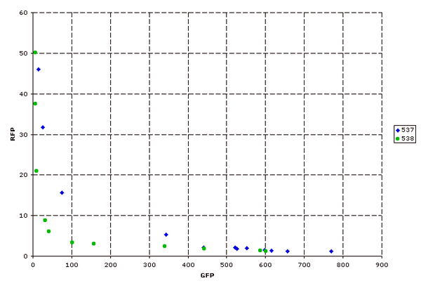 A new construct, labeled I13534, was built around with I13457 insertion site and the internal MCS introduced. Additionally, the construct was moved to a lower copy plasmid (pSB4A3) for further study. Relative to previous efforts, I13534 showed a much higher RFP signal at any given GFP signal: by comparison to the GFP positive control, the RFP signal for I13534 was clearly higher.