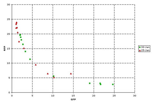 Experiments conducted with the single RNAseE sites showed that the short site worked equally as well as the longer site. Additionally, the plots of RFP vs. GFP were very similar for I13513 (RFP first) and the new construct with GFP first followed by an RNAseE site.