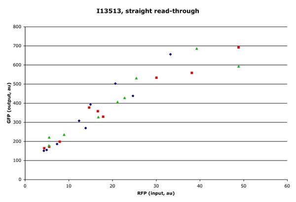 Two plasmids (I13513 and I13514) were constructed, one with GFP before the MCS and mRFP after, the other with the fluors reversed. First, the plasmids were characterized without a part in the MCS (specifically, without the ends capped and the MCS introduced). A significant difference was noticed between the two plasmids. When GFP was the first message on the transcript, the RFP signal was almost an order of magnitude stronger than when RFP was the first message. The GFP signal was nearly unchanged in the two cases.