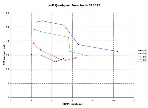 Next, parts were ligated into the insertion site and characterized. A quad-part inverter, Q04400, was the standard initial part. This inverter uses tetR and a strong RBS. Both I13537 and I13538 gave similar results for this characterization.