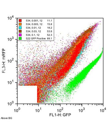 A strong RFP signal was very important. GFP showed a slight bleed into the RFP channel, so if the GFP signal was significantly higher than the RFP signal, then the compensation would become increasingly necessary.