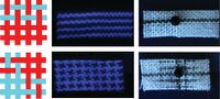 Figure 3. Fabric patterns with heterogenous surface. The 'red' are hydrophobic yarns, while the 'blue' are hydrophilic yarns. The second column are UV-illuminated images where only hydrophilic polyester yarns are shown. The third column shows water droplets status on the microfluidics.[8]