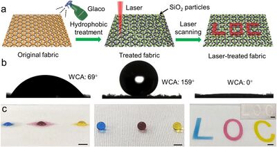Figure 2. a. Hydrophobic treatment and laser scanning; b. contact angle changes during fabrication; c. dye droplets on original, hydrophobic and laser scanning treated fabrics.[4]