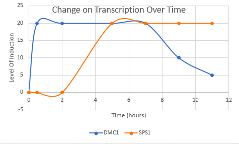 Choose two genes from Figure 4.6b (PDF of figures on Brightspace) and draw a graph to represent the change in transcription over time. You can either create your plot in Excel and put the image up on your wiki page or you can do it by hand and upload a picture or scan