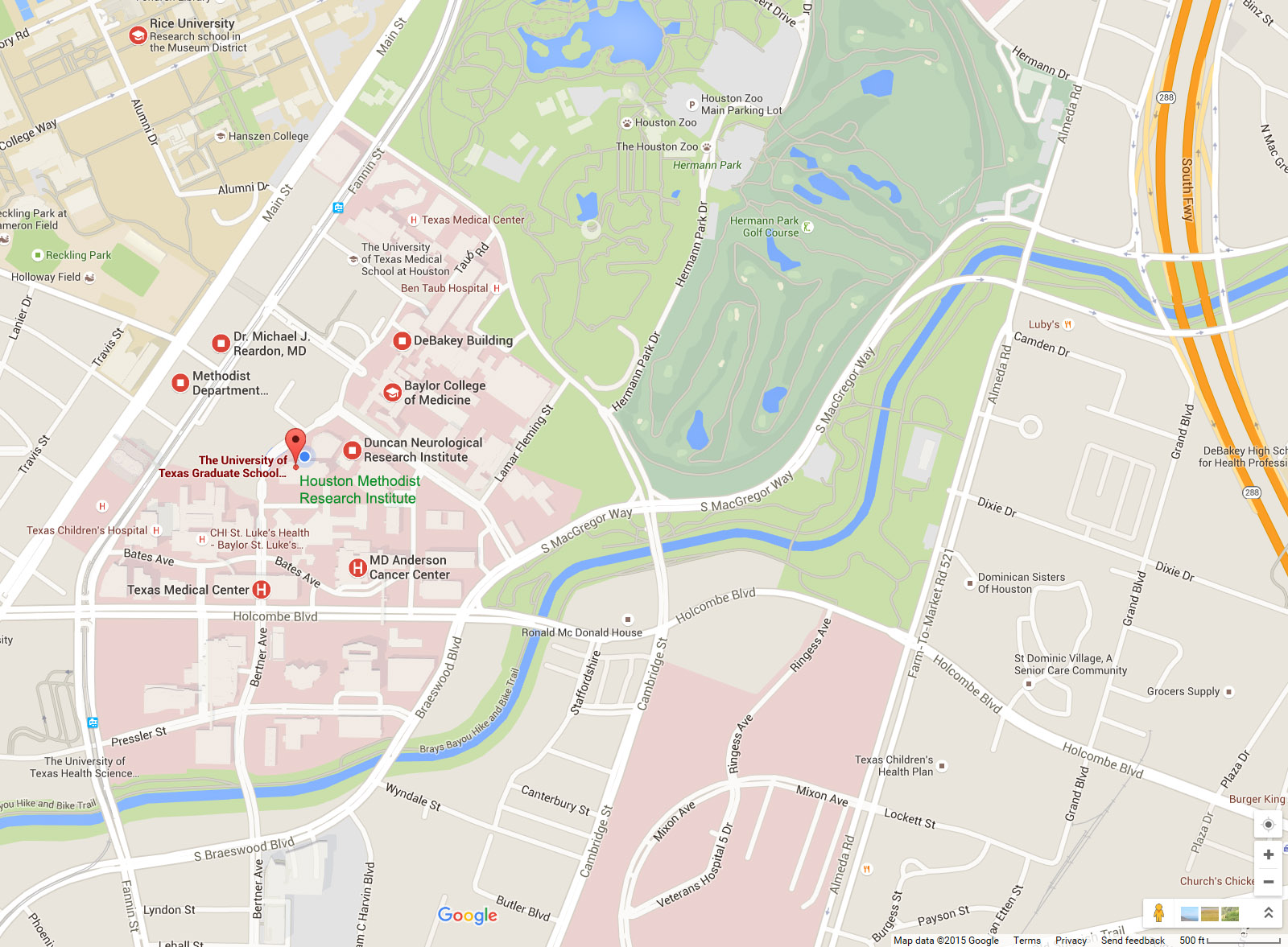 location of HMRI, BCM, MD Anderson, UT-HSC and Rice University at the TMC area.