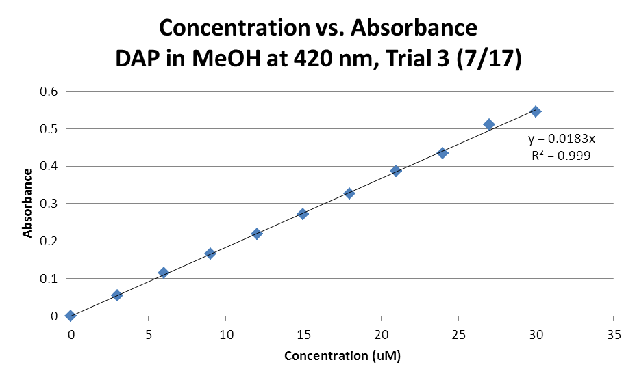 File:07172013 Molar Absorptivity DAP MeOH 420nm GRAPH T3.png