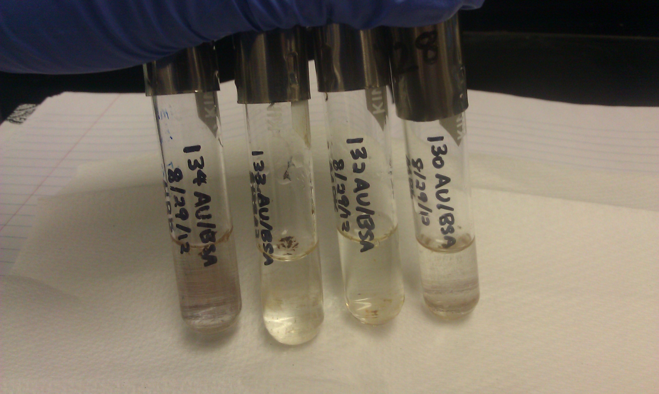 The 130 Au/BSA, 132 Au/BSA, 133 Au/BSA, and 134 Au/BSA solutions from August 29. The solution was made without the parafilmed spatula. THe solution spent 4 hours in a 85°C oven.