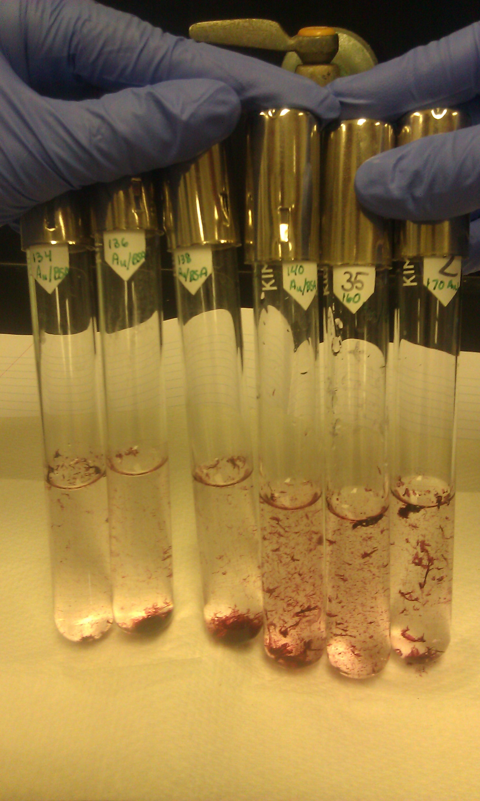 The 134 Au/BSA, 136 Au/BSA, 138 Au/BSA, 140 Au/BSA, 160 Au/BSA and 170 Au/BSA solutions from Dr Miller's batch from August 30. The solution was made with the parafilmed spatula. THe solution spent 4 hours in a 85°C oven.