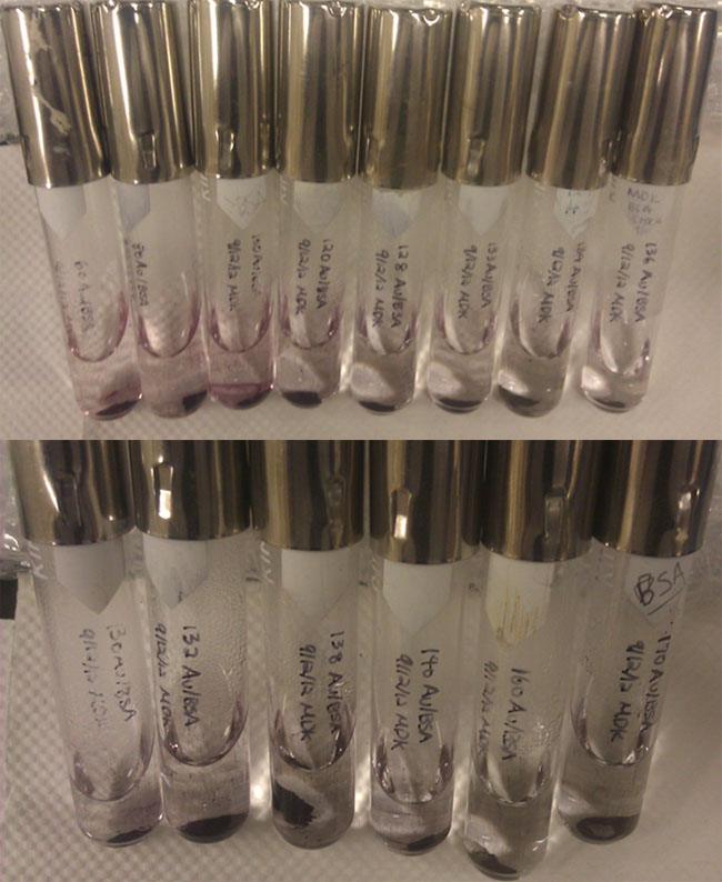 Au/BSA solutions made September 12th, ranging from 60μM to 170μM. Note that an error occurred when making the stock solution for the HAuCl4 such that the stock was less concentrated than expected. Because of this, all the solutions made in this batch are technically above 133 μM AuNP/BSA ratio, so all the solutions created fibers.