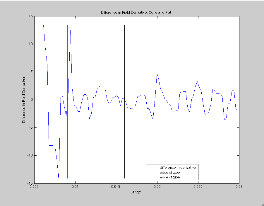 The difference in the derivative between the control magnetic yoke and a cone magnet and two small cylinders flanking a flow cell. A positive value indicates that the derivative in the control is greater. The derivative is measured in Tesla per inch, and the length is measured in inches. Notice how much noise there is.