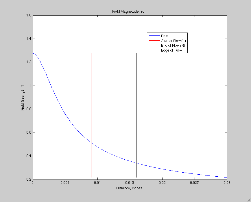 Magnetic field magnitude as a function of length for a iron core electromagnet.