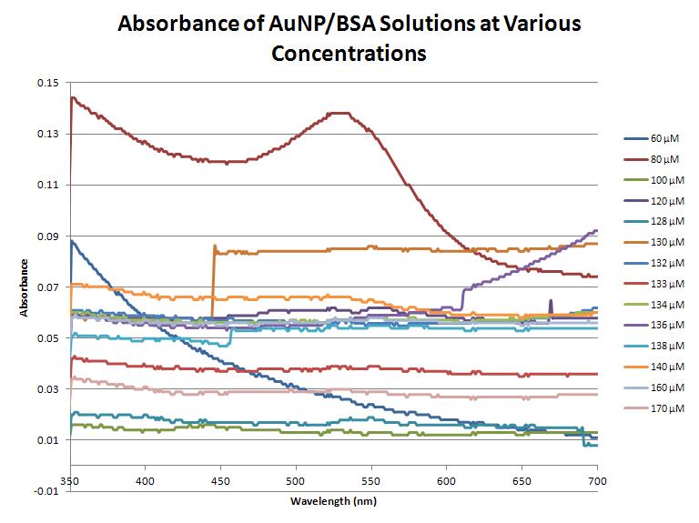 Absorbance of AuNP/BSA solutions at concentrations ranging from 60 μM to 170 μM to determine the formation of AuNPs.