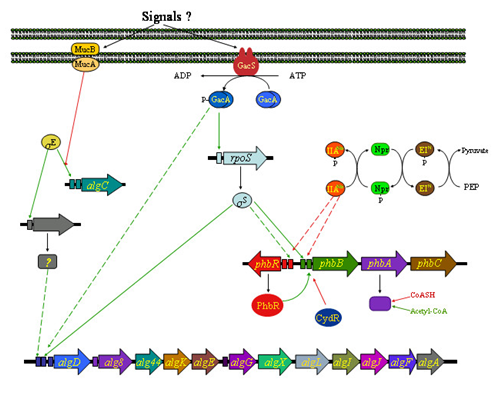 Organization of the A. vinelandii alginate and PHB biosynthetic genes. A model for the regulation of the synthesis of these polymers is presented. Green lines: positive regulation; red lines negative regulation; dashed lines indicate unknown intermediates or unknown mechanism of regulation. Promoters are indicated as coloured rectangles.