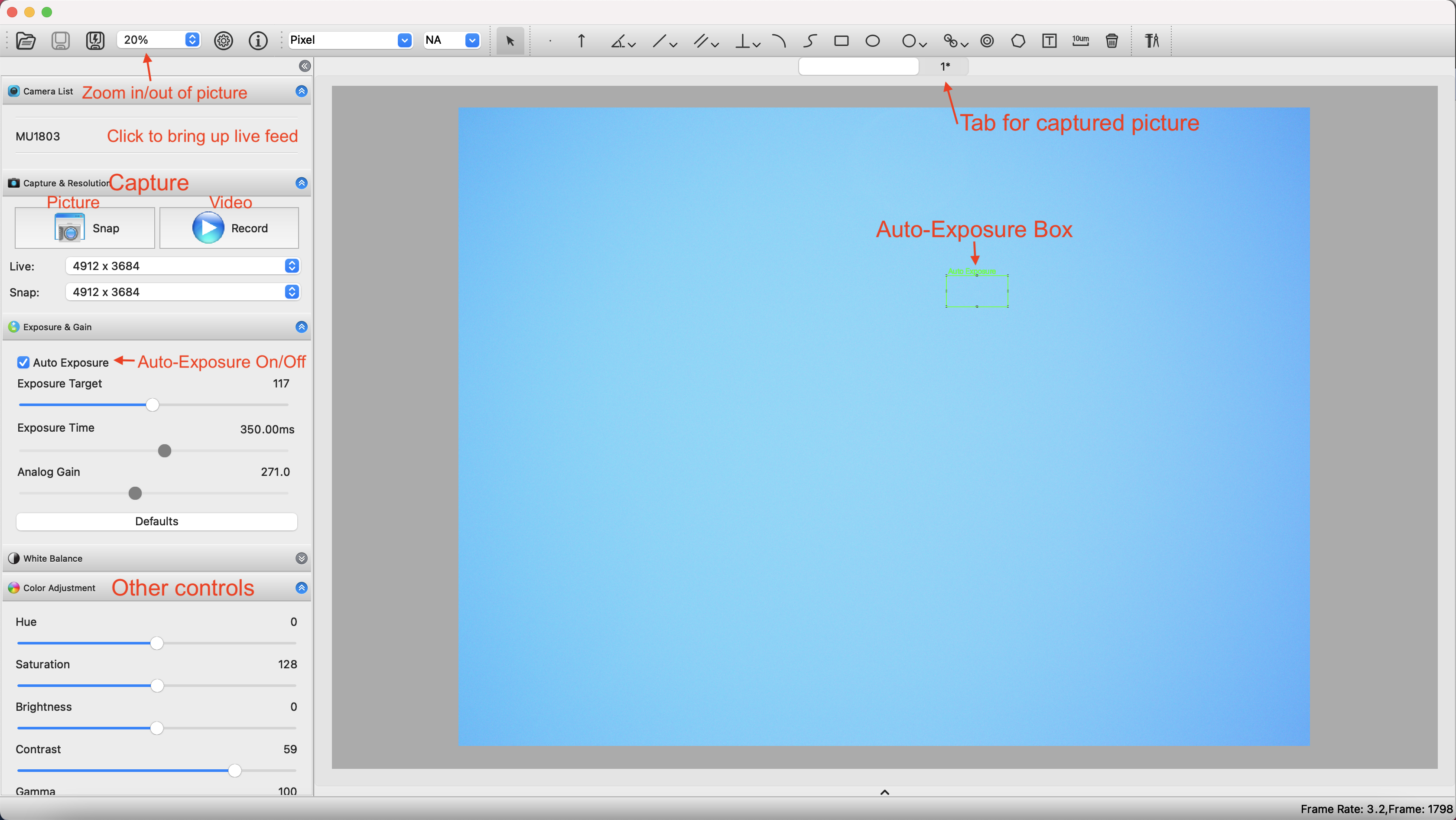 Representative view of the AmScope software interface with annotations