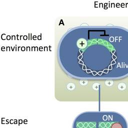 Genetic safeguard strategies. Recombinant DNA (bright green) is introduced into the host chromosome (white wavy lines). Two pathways for engineered auxotrophy (A,B) kill synthetic organisms (blue) once they lose access to a supplement (+) in a controlled environment. The supplement either (A) suppresses a toxic gene product (−) or (B) provides nutrition to compensate for a genetic deletion (red X). The induced lethality system (C) produces a toxic gene product (−) in response to an inducer (i) such as IPTG, sucrose, arabinose, or heat. Gene-flow prevention (D) is accomplished by placing a toxic gene into the recombinant DNA (dark blue/bright green circle) in an immune host. Transfer of the recombinant plasmid kills unintended host cells.