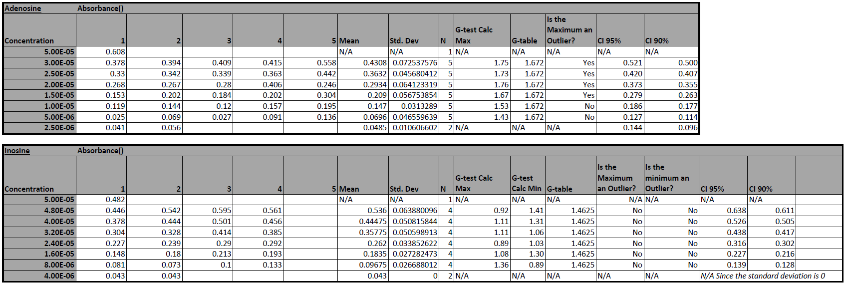 Statistical analysis of Inosine and Adenosine Class Data