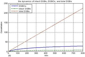 Fig.1. The kinetics of DSBs generation and repair process under IR=8Gy. (a) The stochastic trace of DSBs generation induced by continuous IR; (b) The dynamic relationships among intact DSBs, DSBCs and resulting DSBs.