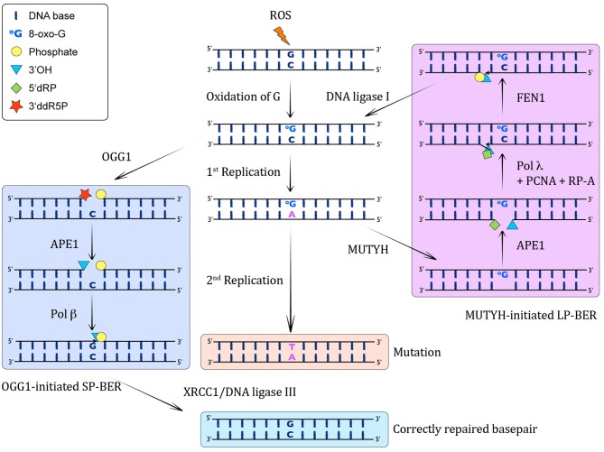 Right column: The A:8-oxo-G base pairs can be recognized by MUTYH, which catalyzes the excision of the wrong A from opposite 8-oxo-G, leading to the formation of an AP site. This AP site is further processed by APE1, which results in a 1 nt gap with 3′OH and 5′dRP moieties. The incorporation of the correct C opposite 8-oxo-G and one more nucleotide is performed by pol λ in collaboration with the cofactors PCNA and RP-A, thus performing strand displacement of the downstream DNA strand. FEN1 cleaves the 5′ flap, leading to a 5′P moiety, which can be ligated by DNA ligase I to yield an intact C:8-oxo-G containing double-stranded DNA. This C:8-oxo-G is then again substrate for OGG1-mediated removal of 8-oxo-G (left column).