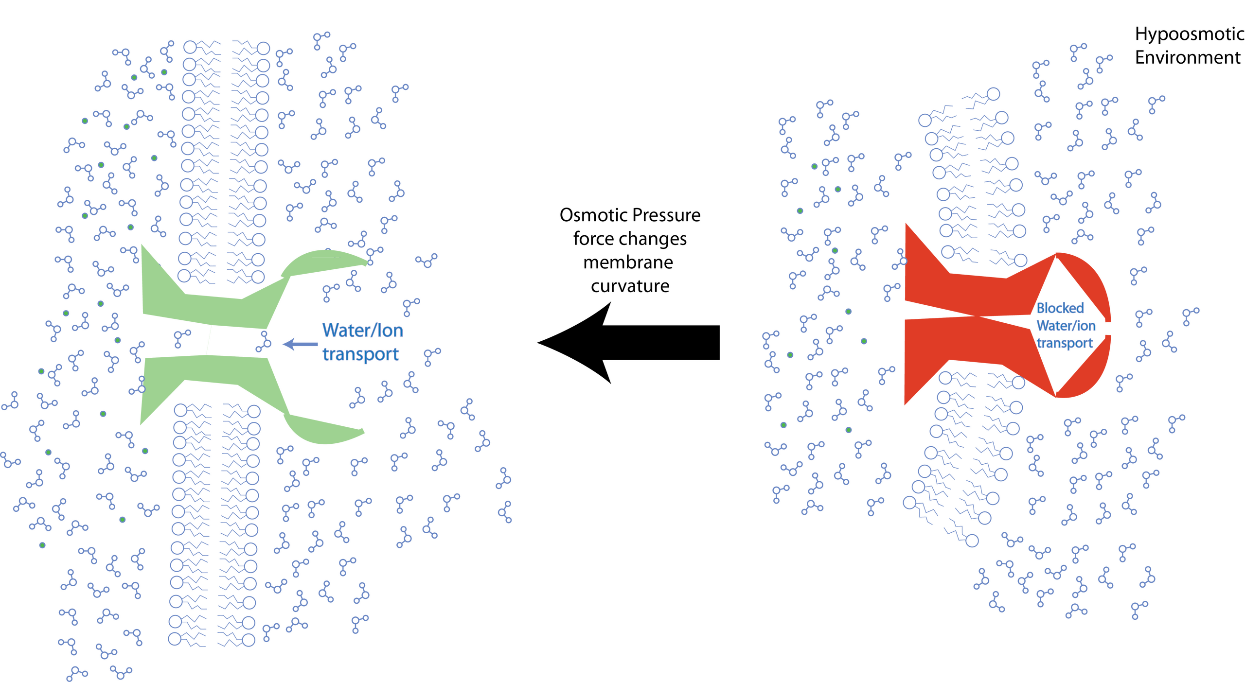 Diagram indicating how membrane curvature mediates opening of the Msc (mechanosensitive channel) proteins in E. Coli. Osmotic pressure causes unequal forces on either side of membrane, which changes the structure of the phospholipid bilayer. The change in the bilayer changes the conformation of Msc, which signals to open the channel. Water and/or ions can then flow across the membrane to equalize osmotic pressure and prevent cell death. Image created by contributor, Kevin Baldridge
