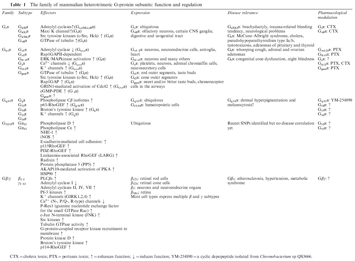 Table showing G Protein effectors and expression patterns.