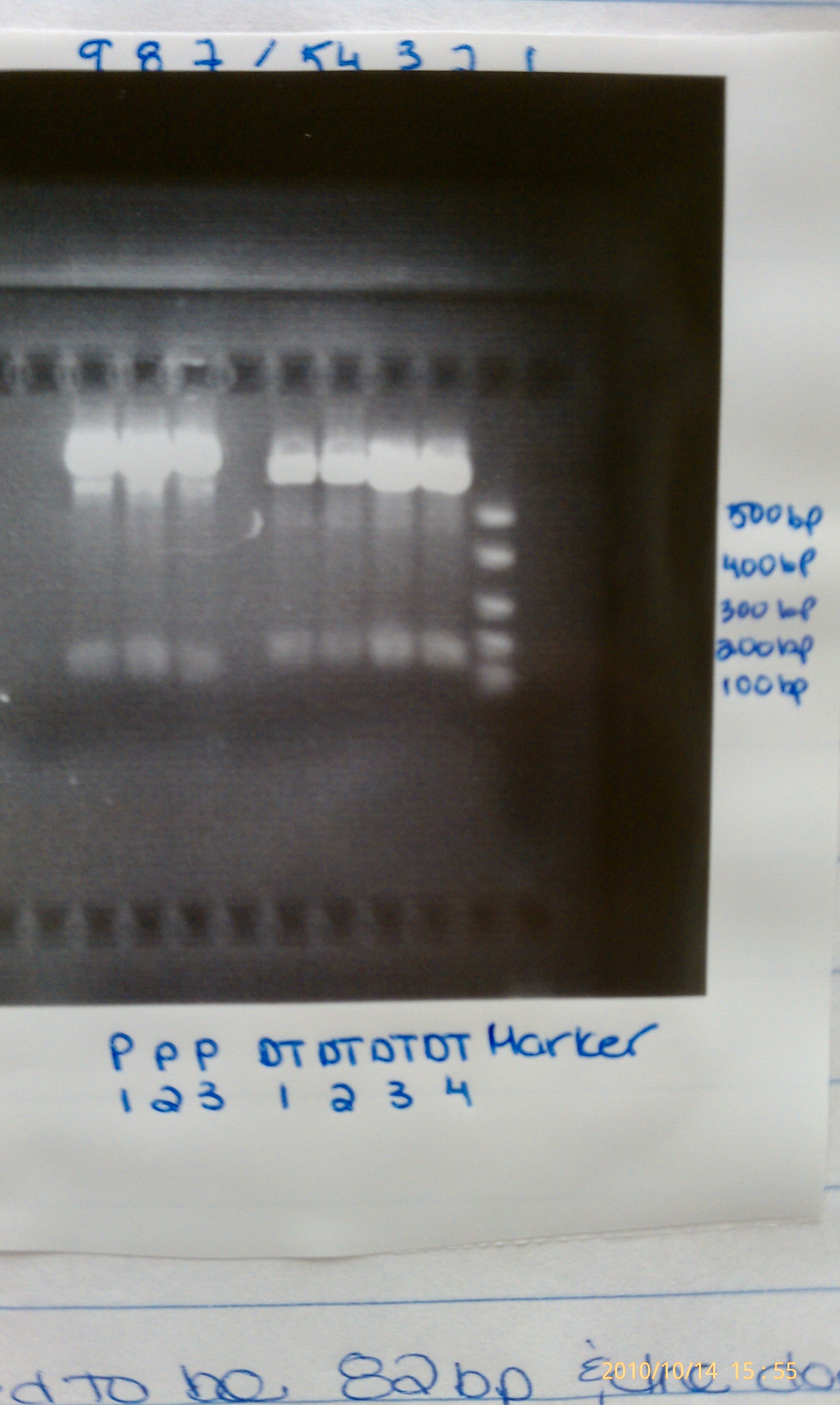 Gel photo from 10/12 of our Promoter(lanes 6-9) and Double Terminator(lanes 2-5)