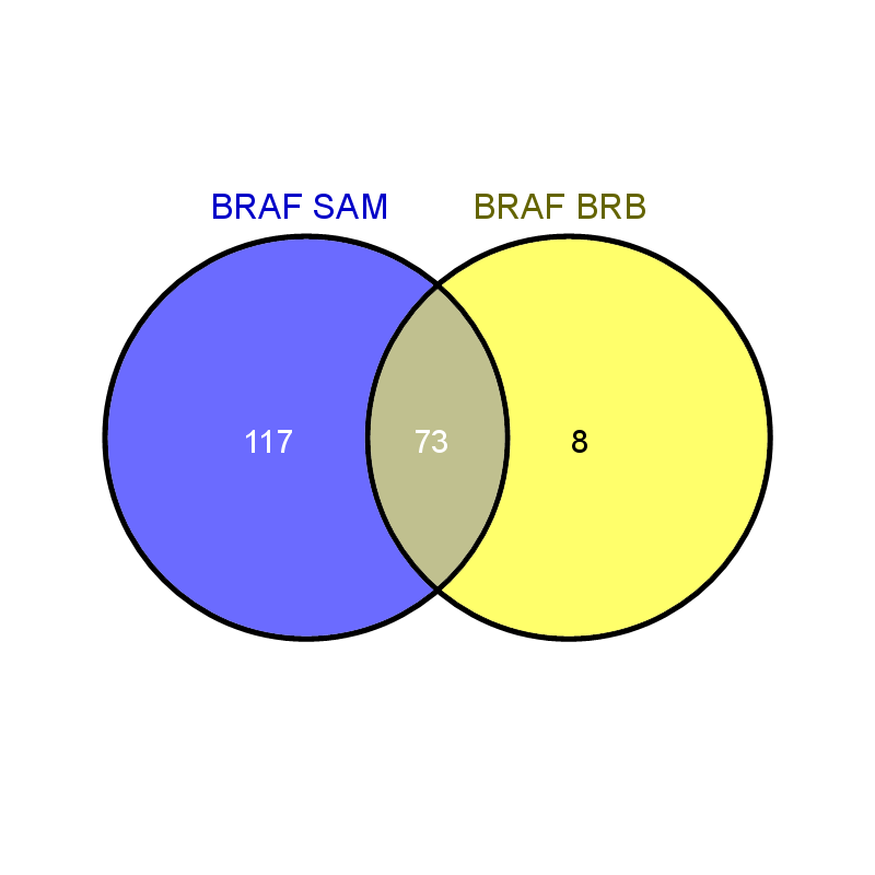 Venn diagram comparing genes in BRAF classifiers generated by the BRB ArrayTools Class Comparison tool and SAM