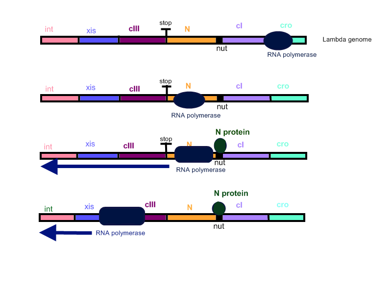 Diagram depicting the role of N protein as an antiterminator in the early developmental stages of Lambda