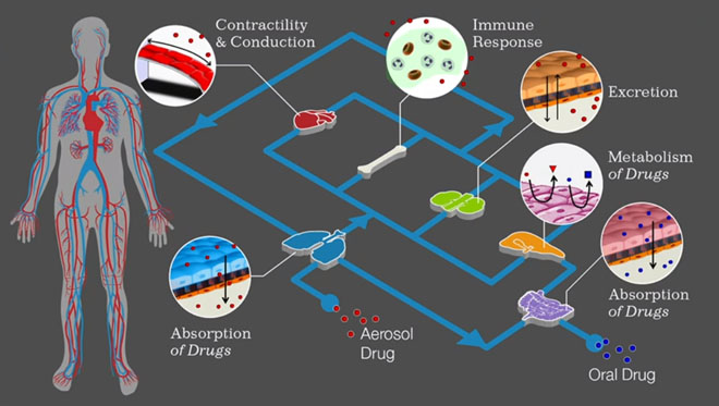 Figure : The concept of an organ-on-a-chip device modeling multiple organ functions