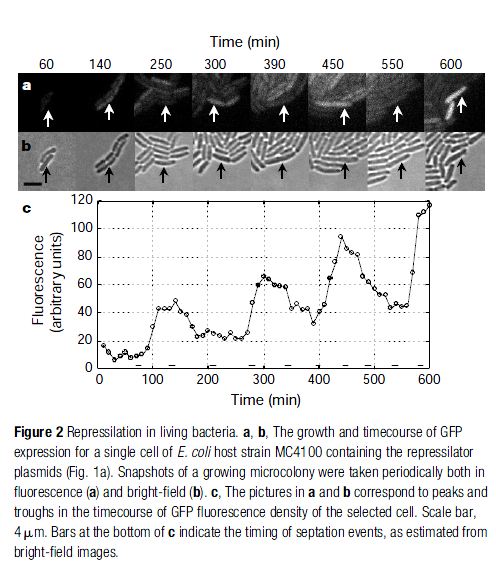 Image of the oscillation of GFP expression of E. coli containing the two plasmids.