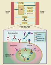 This figure illustrates the various kinetic processes that occur during the distribution and uptake of a drug. (Taken from Nat Biotechnol. 2005 Feb;23(2):191-4. )