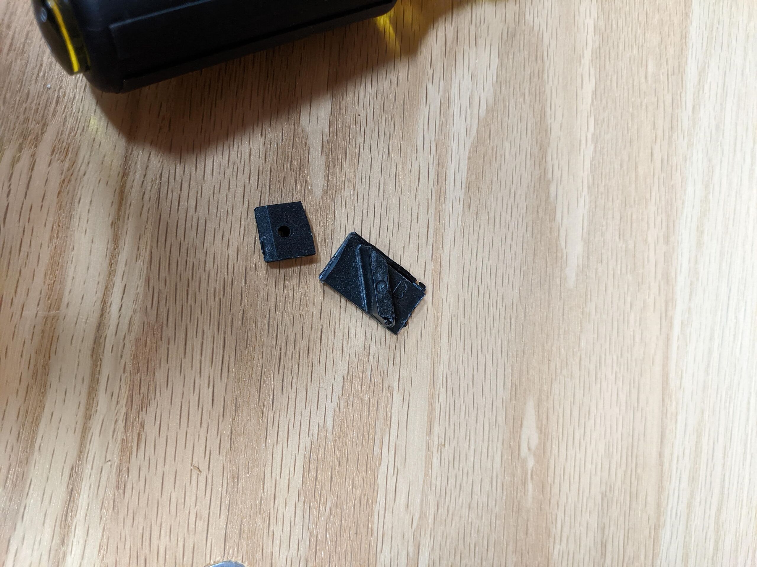Broken plastic pieces from the safety mechanism.