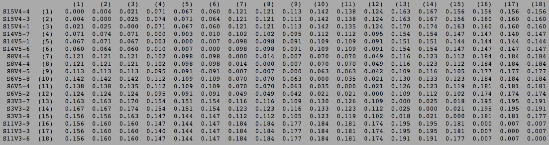 Clustal distance matrix for the rapid and moderate progressors. Nicole Anguiano 14:33, 30 September 2014 (EDT)