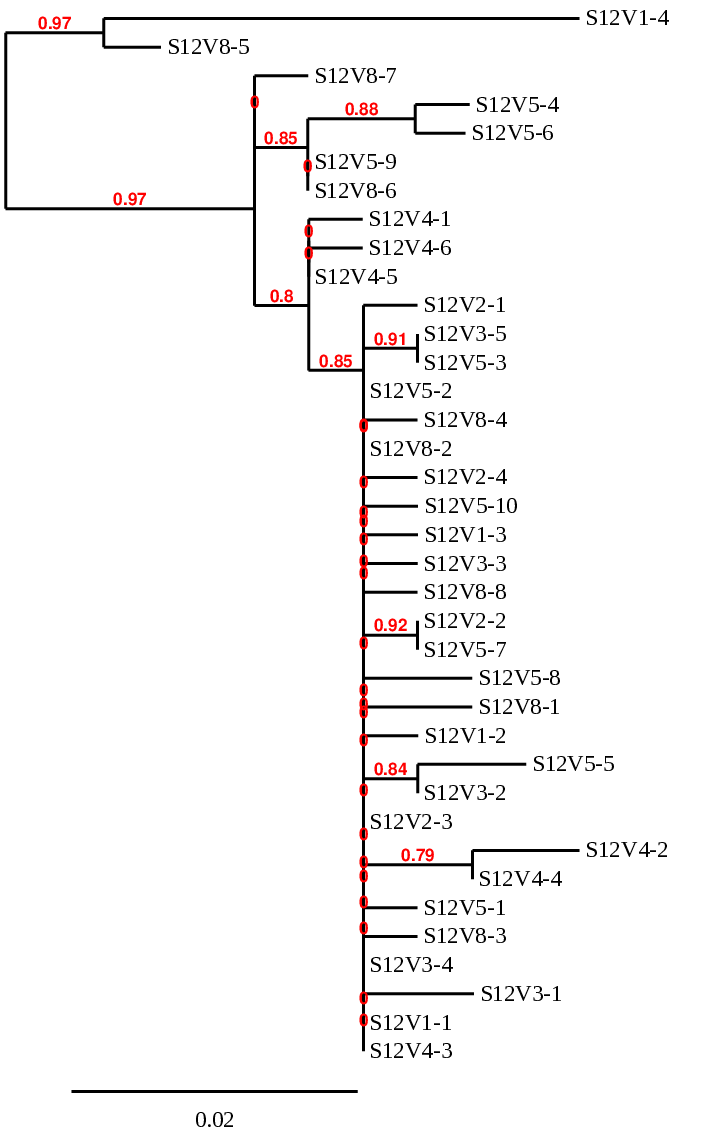 | current | 21:33, 19 February 2020 |  | 709 × 1,140 (19 KB) | Carolyne (talk | contribs) | This phylogenetic tree shows the evolutionary relationships between all of the clones taken from Subject 12 over the course of the study. |