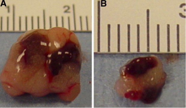Figure X: Regrown spleens harvested 16 weeks after initial transplant of tissue from both the TES methodology (A) and the conventional spleen slice methodology (B).