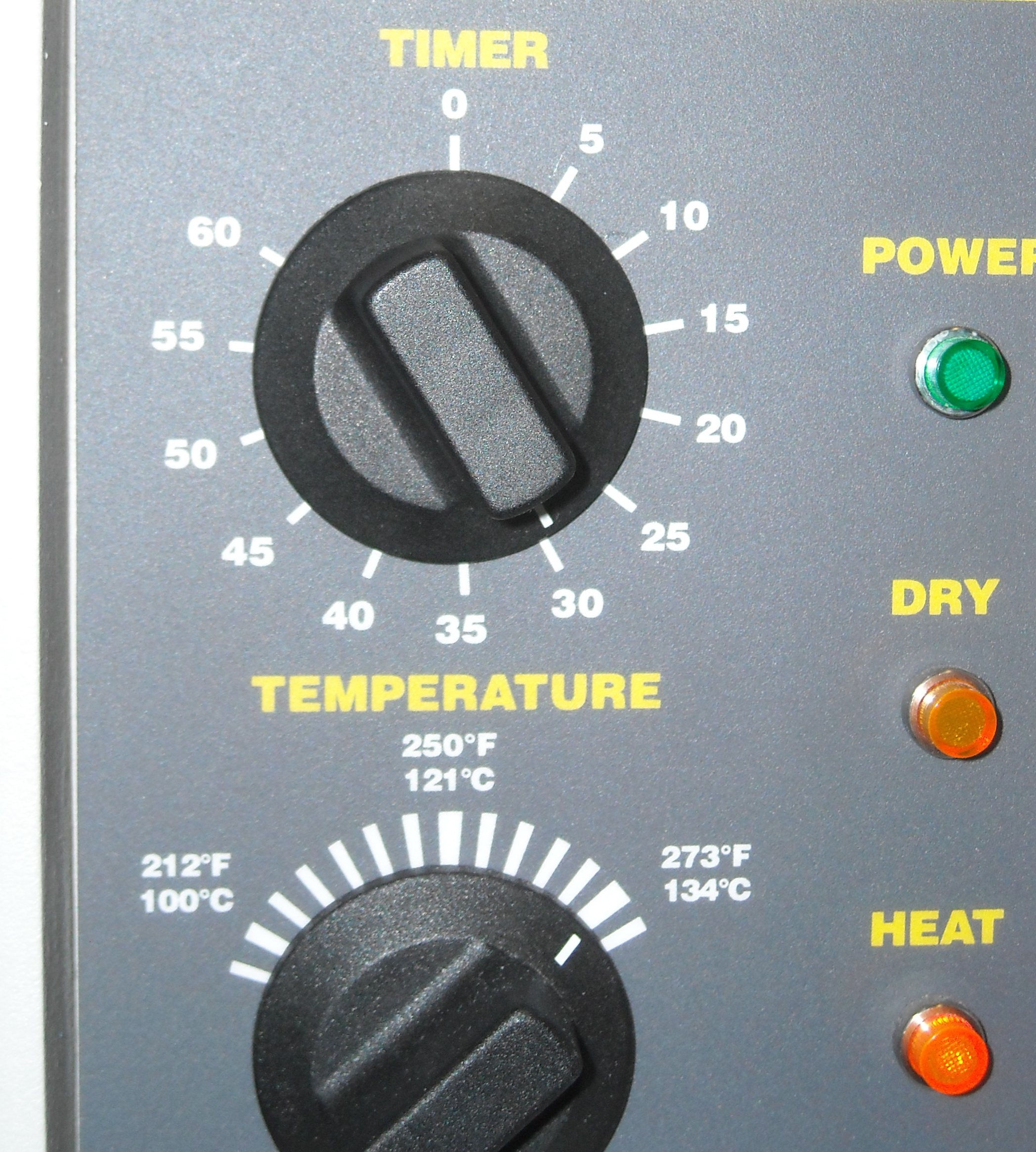 This is a picture of the autoclave with both the timer and temperature set for a sterilization cycle. Note how the temperature is set for 134°C, time is set at thirty minutes and the orange heat light is on.